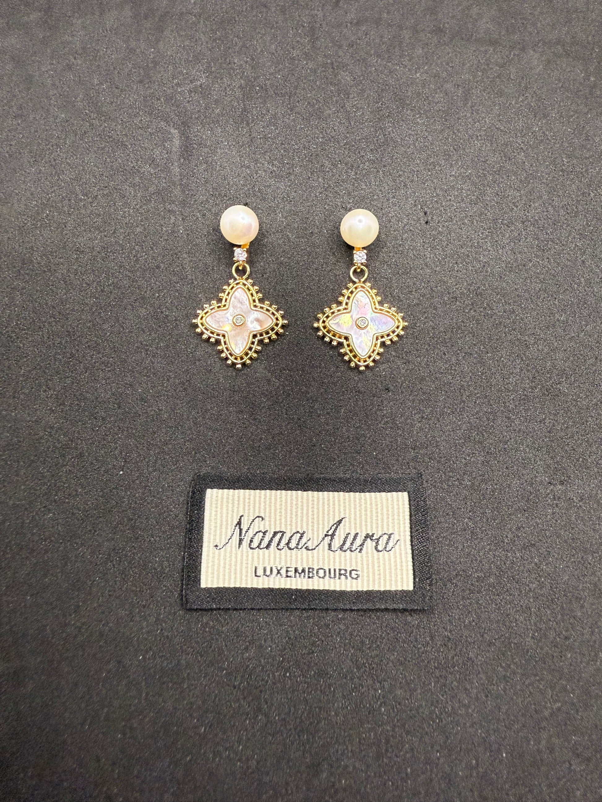 The Golden Bloom Pearl Earrings radiate timeless elegance with a graceful balance of natural elements and refined craftsmanship. Each earring features a luminous natural pearl stud and a delicate four-petal charm crafted from iridescent mother-of-pearl, highlighted by a sparkling zircon at its heart. Set in gold-plated metal, these earrings exude sophistication and gentle luxury.